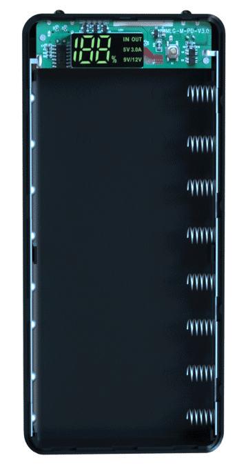 Корпус для павербанка на 8 литиевых аккумуляторов типа 18650, можно установить от 1 до 8 батарей. Имеет дисплей с индикацией зарядки и напряжением входов/выходов.